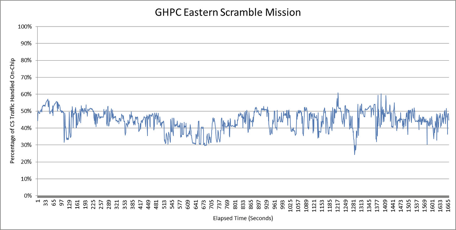 The two bar graphs above already hint at how bandwidth demands and cache hitrates vary across workloads. Those figures vary within a workload as well, though plotting all of the logged data would be excessive. Variation both across and within workloads makes it extremely difficult to summarize cache efficacy with a single hitrate figure. Plotting the percentage of traffic at the CS not observed at the UMCs as a proxy for hitrate further emphasizes that point.