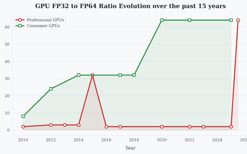 Buy an RTX 5090, the fastest consumer GPU money can buy, and you get 104.8 TFLOPS of FP32 compute. Ask it to do double-precision math and you get 1.64 TFLOPS. That 64:1 gap is not a technology limitation. For fifteen years, the FP64:FP32 ratio has been slowly getting wider on consumer GPUs, widening the divide between consumer and enterprise silicon. Now the AI boom is quietly dismantling that logic.