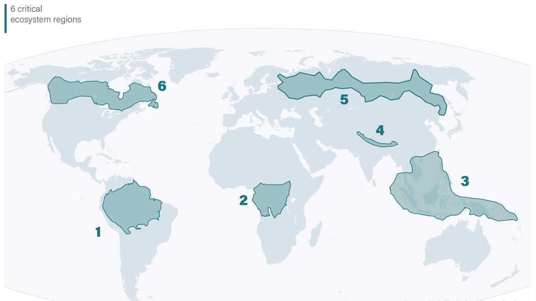 The literature provided in the report explains why these 6 specific regions are key. The Amazon, Congo and Boreal forests are framed as globally significant “regulators”. Their degradation can amplify Earth-system feedbacks (including carbon-cycle disruption) and destabilise entire production systems. The Himalayas matter primarily through their scale of impact on water and food security for vast populations, with knock-on risks of conflict and migration in strategically sensitive areas. South-East Asian coral reefs and mangroves are highlighted for their direct links to coastal livelihoods, fisheries and coastal protection, meaning collapse can rapidly translate into displacement and instability in one of the world’s most trade-integrated regions.