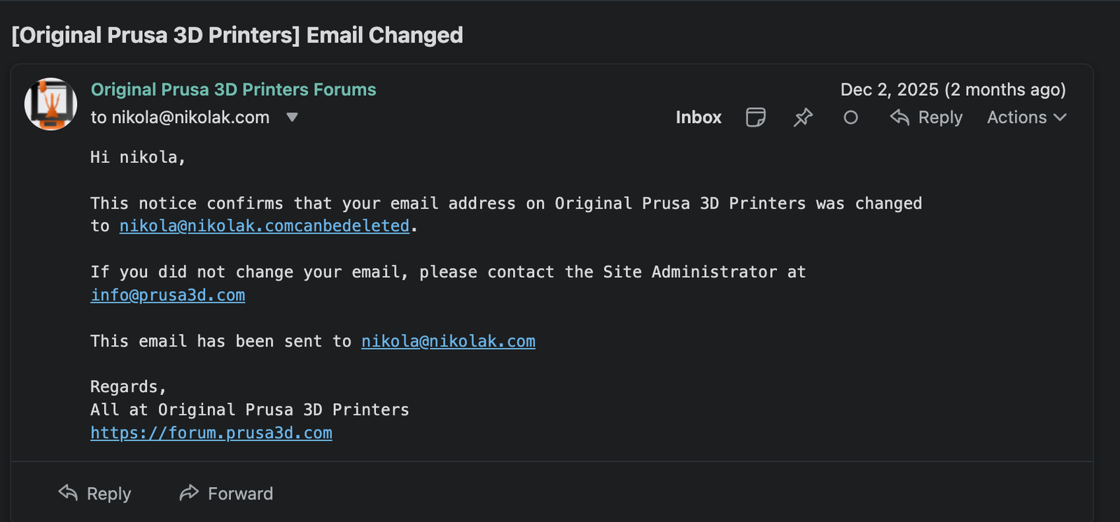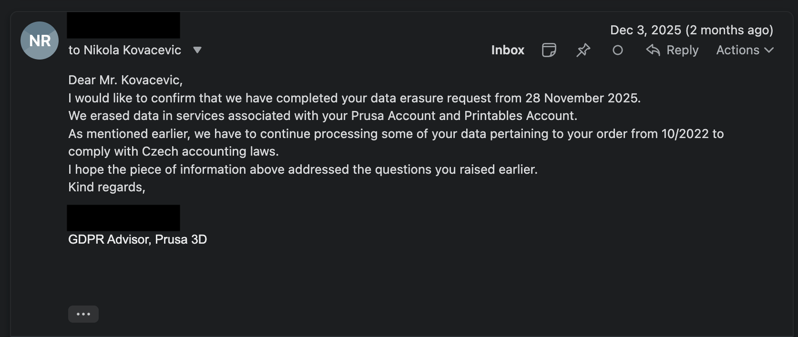 Let’s look at how one of the bigger companies in 3D Printing world, that often gets mentioned for their privacy and the fact that they’re from EU and GDPR compliant, Prusa 3D, handles a simple request to delete user data: