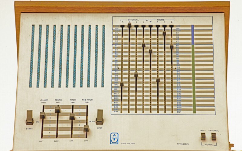 While it looks like something you’d find on some forgotten warehouse shelf, the Triadex Muse is an important piece of electronic music history. Developed by Edward Fredkin and Marvin Minsky at MIT in 1969, and commercially released in the early 1970s, it was the first algorithm-based sequencer/synthesizer intended for home consumers. It’s estimated that there were only 280 – 300 produced, making it a rare piece of gear.