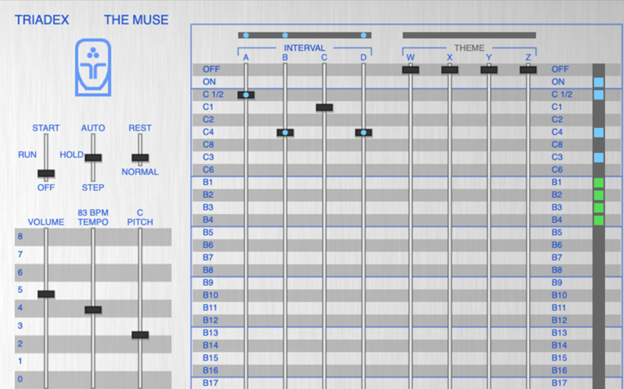The INTERVAL block has four sliders that select notes from the major scale. The positions of A, B, and C determine the pitch, while D adds an octave. There are no flatted thirds or minor scales. You can’t play the blues. Though you might want to if you once owned the Triadex Muse and look up how much they’re currently going for—$$$.