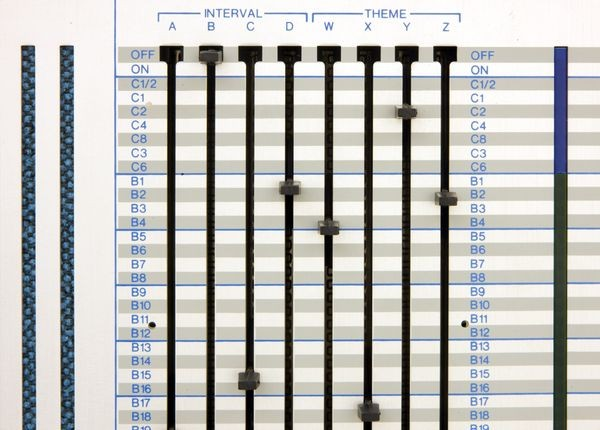 The beauty of the Triadex Muse is in its simplicity. There’s no memory, no CPU, and no firmware. Just integrated circuits and electricity. Unlike the 1959 IBM 7090 mainframe computer, which was fed programming instructions via paper punch cards in coaxing out such party hits like Frère Jacques on the 1962 album Music from Mathematics, the only user input here is positioning sliders and flipping a couple switches.