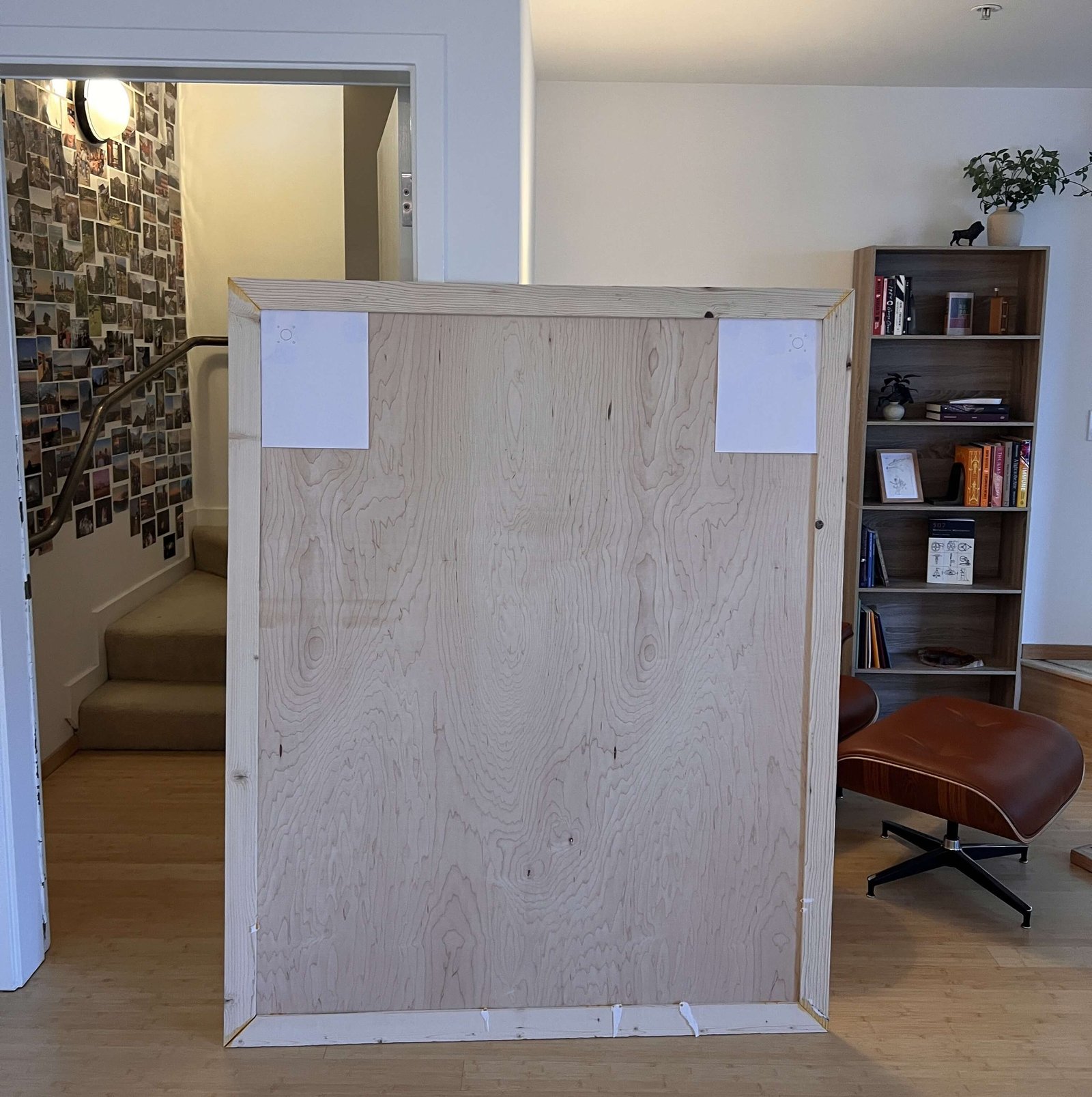 I wanted to frame this sheet of plywood with some miter-style border. I tried pulling this stunt off with a Japanese handsaw and failed my angles miserably, so I wound up buying a cheap miter saw to finish the job. My buddy Graham and I took out a 1/4” deep dado on the back inside edge of all four plywood boards that make up this miter-frame, so that our 48×60” plywood backing can sit flush within it.