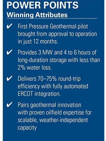 The geothermal pilot, SMECI Well #1, is the first piece of that vision to materialize. Moving from funding approval to “ready to store” in just 12 months, Sage completed drilling, fracture stimulation, surface-facility installation, and commissioning by August 2025. Leveraging innovative design, existing oilfield expertise, and streamlined permitting, the 3-MW/4–6-hour system has transformed a pioneering underground energy storage concept into a fully built asset in record time. While the project is still awaiting grid interconnection—currently slated for December 2025—the pioneering project has showcased a new model for firm, dispatchable capacity in ERCOT’s evolving grid, and is well worthy of this POWERTop Plant award.