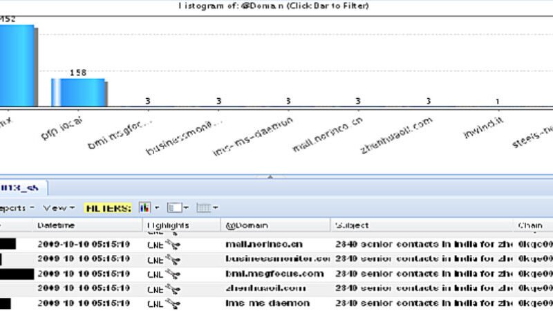 Email User Name | Datetime | Highlights | @Domain | Subject | Chain [REDACTED] | 2009-10-10 05:15:10 | CNE | mail.norinco.cn | 28-10 senior contacts in India for zh | 0kqe00g01mrdii@mail.norinco.cn&kate.strut [REDACTED] | 2009-10-10 05:15:10 | CNE | businessmonitor.com | 28-10 senior contacts in India for zh | 0kqe00g01mrdii@mail.norinco.cn&kate.strut [REDACTED] | 2009-10-10 05:15:10 | CNE | bmi.msgfocus.com | 28-10 senior contacts in India for zh | 0kqe00g01mrdii@mail.norinco.cn&kate.strut [REDACTED] | 2009-10-10 05:15:10 | CNE | zhenhuaoil.com | 28-10 senior contacts in India for zh | 0kqe00g01mrdii@mail.norinco.cn&kate.strut [REDACTED] | 2009-10-10 05:15:10 | CNE | lms-ms-daemon | 28-10 senior contacts in India for zh | 0kqe00g01mrdii@mail.norinco.cn&kate.strut