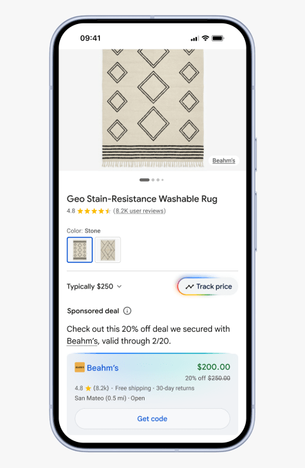 In another consumer-facing change, Google said it will now allow brands to offer a special discount to users as they search for a product recommendation when using AI mode. For example, if you’re searching for a rug with a query like “I’m looking for a modern, stylish rug for a busy dining room. I host a lot of dinner parties, so I want something that’s easy to clean,” brands can set up their campaign in a way to offer you a discount at that moment.