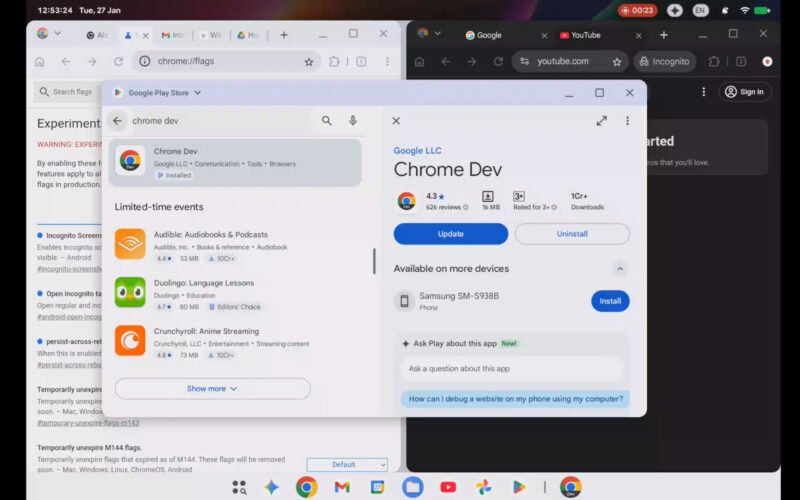 Otherwise, the screen recordings show a status bar that includes a screen recording indicator, Gemini icon, and the recent Android 16 Wi-Fi and battery icons. The recordings show the taskbar too, albeit with the start button now much closer to the center as seen in Android 16’s desktop mode. By contrast, Chrome OS places the start button in the bottom-left corner. We also get a look at the familiar desktop windowing UI, along with a peek at the Play Store app running on the device.