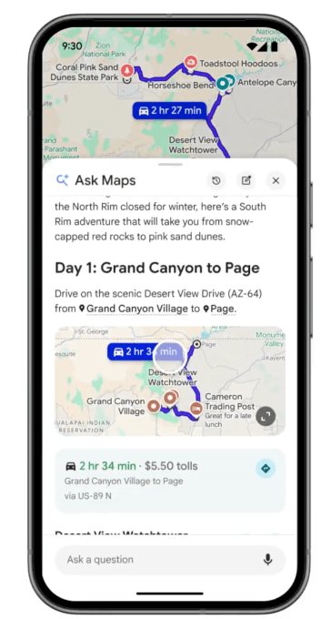 The tech giant says the feature can also be used for quick trip planning. For example, you could ask: “I’m heading to the Grand Canyon, Horseshoe Bend, and Coral Dunes. Are there any recommended stops along the way?” The maps will then give you directions, ETAs, and tips from real people, like how to find a hidden trail or get a free entry ticket.