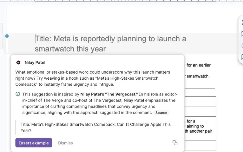 Additionally, the way the suggestions are presented could be misleading. In Google Docs, the suggestions look similar to comments from real users, seemingly simulating the experience of receiving edits from whichever expert the AI is imitating. One suggestion from Grammarly’s AI “inspired by” Verge senior editor Sean Hollister was about adding a parenthetical with context that was already included elsewhere. The only problem is that I’ve actually been edited by the real Sean Hollister, who prefers avoiding repetitive or unnecessary explanations while using straightforward wording and organization.