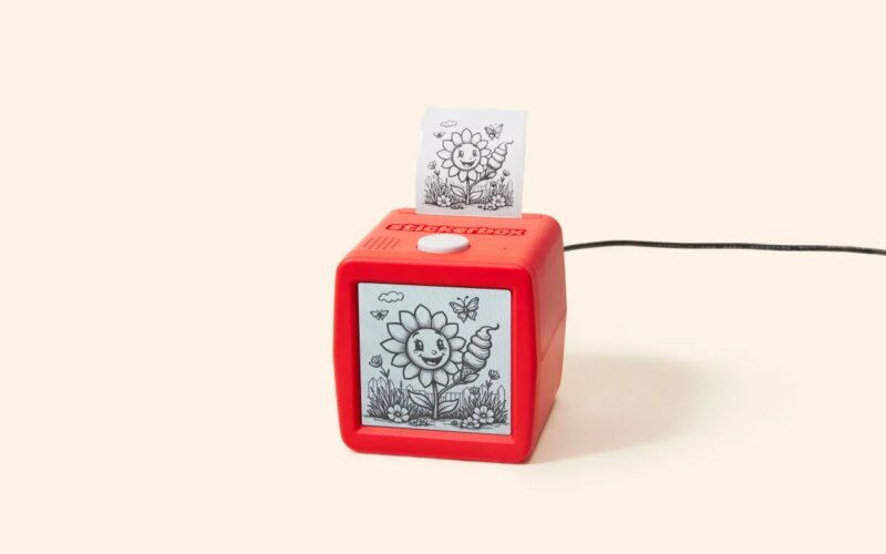 The $99.99 toy itself is a small, bright red box with a black-and-white screen and a large white “push-to-talk” button on top. It comes with three rolls of paper, equivalent to 180 stickers, plus a power cord and colored pens.