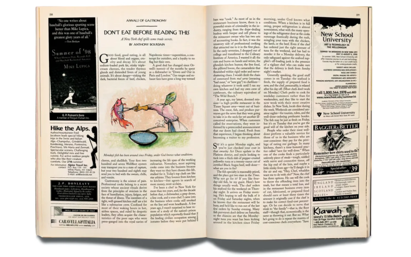 Bourdain’s detailed clip explaining why this is true was first published, on The New Yorkerin a 1999 article titled “Don’t Eat Before Reading This,” which he quickly expanded into “Kitchen Secret.” (The short answer is, “Many fishmongers don’t deliver on Saturday, so the tuna you wanted on Monday night has probably been languishing in the kitchen since Friday morning, under God-knows-what-good-conditions”; the long answer takes you deeper into the culture and psychology of the restaurant business.) He originally wrote it for an alternative weekly magazine called New York. He presseswhich she lined up as a cover story before the editor killed it at the last minute. Bourdain imagined his audience would be insular and small: “I thought I’d write something that would entertain other chefs, and maybe I’d get a hundred dollars, and my fry cook would find this funny,” he recalled in 2017, during an appearance at the New Yorker Festival. When the material found its way to… The New Yorker– After Bourdain’s mother proposed marriage to New Yorker times My colleague, Esther Finn, suggested that Finn’s husband, David Remnick, the magazine’s new editor, might want to take a look — “It changed my life in two days,” he said.