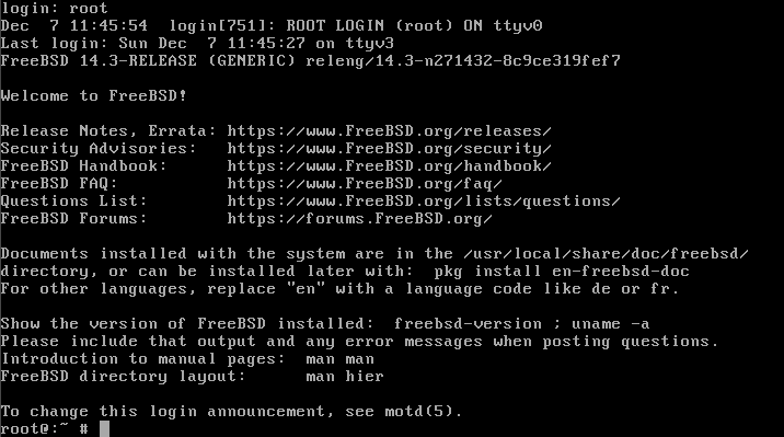 $ ssh [email protected] ([email protected]) Password for root@: Last login: Sun Dec 7 12:19:25 2025 FreeBSD 14.3-RELEASE (GENERIC) releng/14.3-n271432-8c9ce319fef7 Welcome to FreeBSD! ... root@:~ #