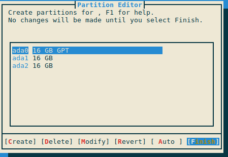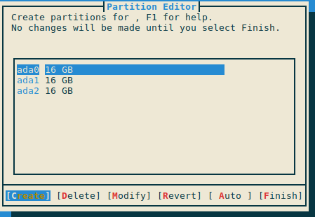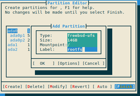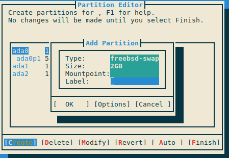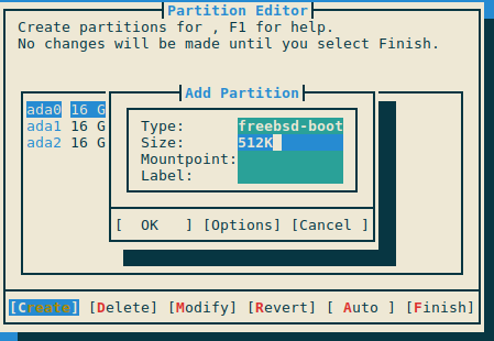 Select ada0 again, click Create, and create a partition for freebsd-boot.