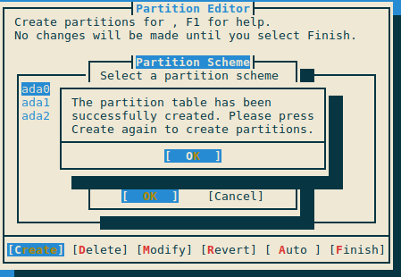 Confirm the changes, and now we have a new partition table on the system drive ada0: