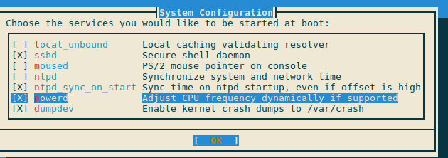 In System Configuration – select sshd, no mouse, enable ntpd and powerd: