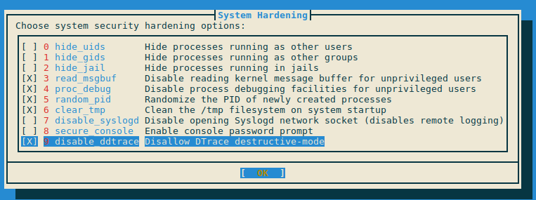 read_msgbuf: allowdmesgaccess for root onlyproc_debug: allowptracefor root onlyrandom_pid: randomize PID numbersclear_tmp: clear/tmpon rebootsecure_console: requirerootpassword for login from the physical console