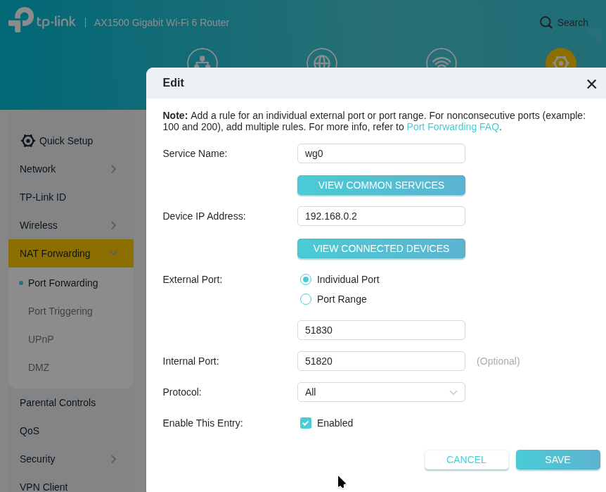 - The Archer AX12 router will have NAT port-forwarding to connect to WireGuard on FreeBSD