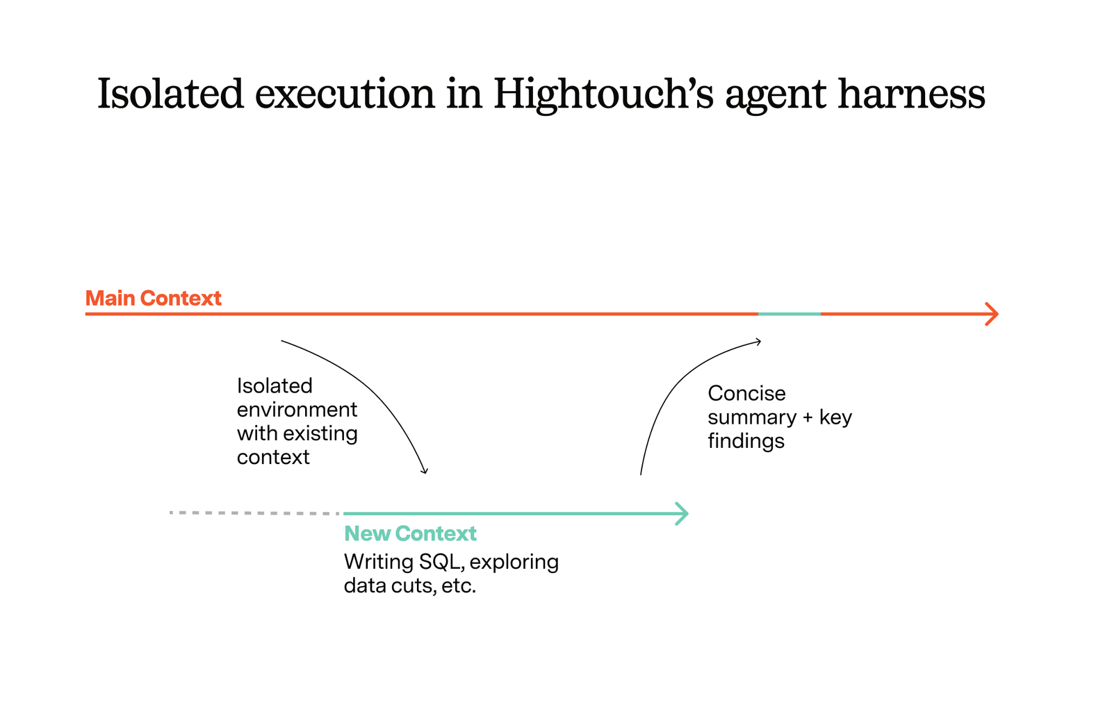 To build it, Hightouch’s engineering team needed to solve a laundry list of interesting context, workflow, and prompt engineering problems that there is no set of commonly accepted solutions for. Based on extensive interviews with their technical team, this post will go through the major components of their agent harness, in particular the idea of agentic delegation:
