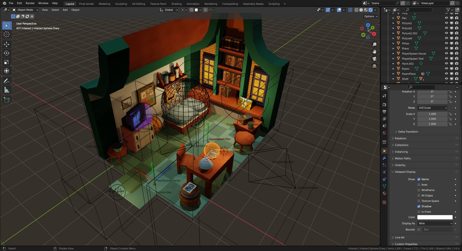 It’s important to mention how I use node names for spawning some objects. For example, you can see an object named Interact.Sphere.Diary selected in the screenshot above. The part before the first dot is the prefab name (in this case “Interact”). The “Sphere” part is used by the physics system to create a sphere physics body for the object (“Capsule” and “Box” can also be used, otherwise the physics shape is created using mesh vertices).