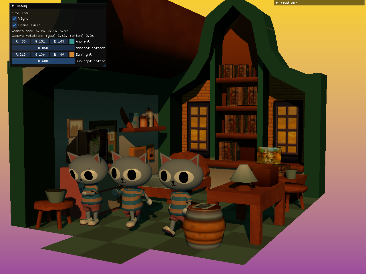 The engine wasn’t implemented as a general purpose engine, which is probably why it took me a few months (and not years) to achieve this. I started by making a small 3D game and separated reusable parts into the “engine” afterwards. I can recommend everyone to follow the same process to not get stuck in the weeds (see “Bike-shedding” section below for more advice).