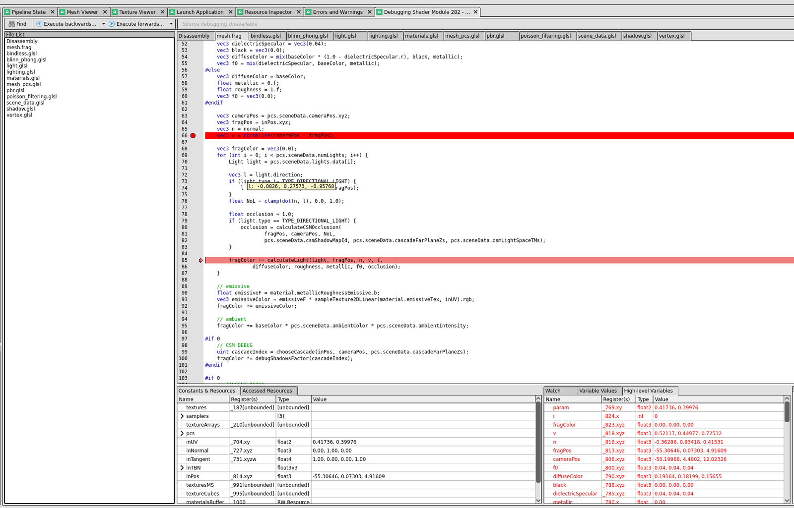 With OpenGL I had to output the values to some texture and color-pick them… which took a lot of time. But now I can debug vertex and fragment shaders easily.