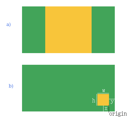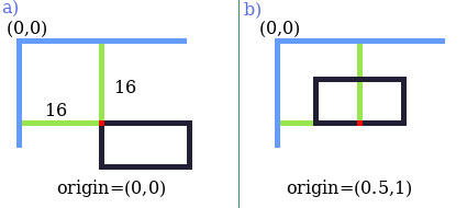 b) The child (yellow) has origin (1, 1), fixed size (w,h) and absolute offset of (x,y) – this way, the item can be positioned relative to the bottom-right corner of its parent (green)