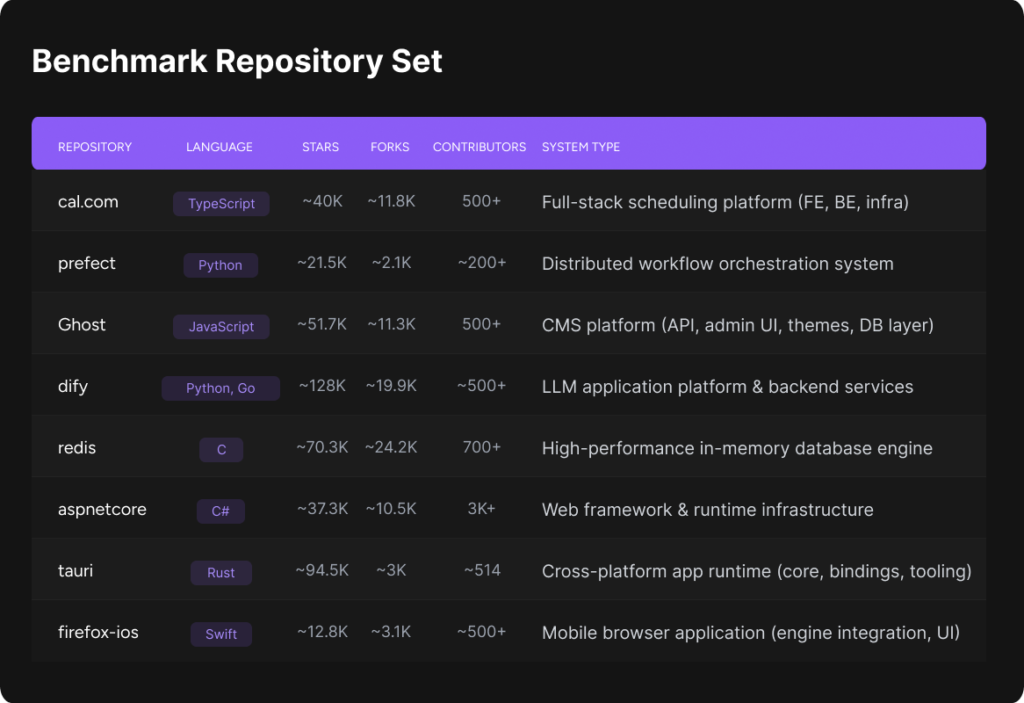 - The benchmark repositories were strategically chosen to create a realistic, system-level code review environment. The core selection criteria focused on two aspects: 1) System-Level Code: Projects are production-grade, multi-component systems (e.g., server logic, FE, DB, API) that reflect the complexity of enterprise pull requests involving cross-module changes and architectural concerns. 2) Language Diversity: The set intentionally spans diverse technology stacks and ecosystems. including TypeScript, Python, JavaScript, C, C#, Rust, and Swift.