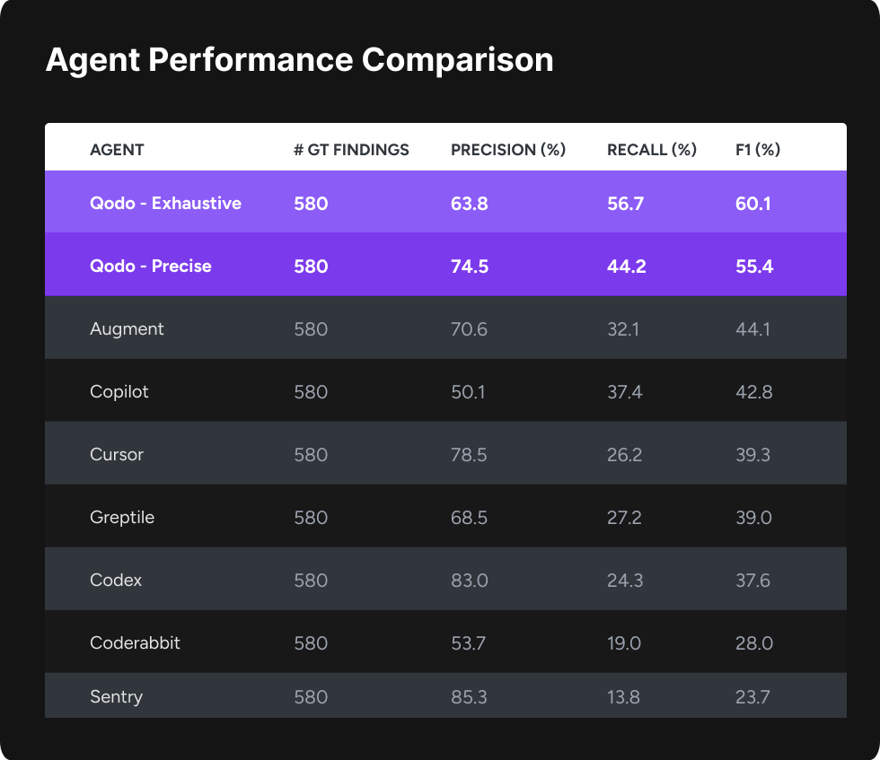 For Qodo, we report results for two operating configurations: Qodo Precise, which reports only issues that clearly require developer action, and Qodo Exhaustive, which is optimized for maximum coverage and recall. Notably, both configurations achieve higher F1 scores than all competing tools in this evaluation. The results reveal a clear and consistent pattern across tools. While several agents achieve very high precision, this comes at the cost of extremely low recall, meaning they identify only a small fraction of the actual issues present in the PRs. In practice, these tools are conservative: they flag only the most obvious problems to avoid false positives, but miss a large portion of subtle, system-level, and best-practice violations. This behavior inflates precision while severely limiting real review coverage.