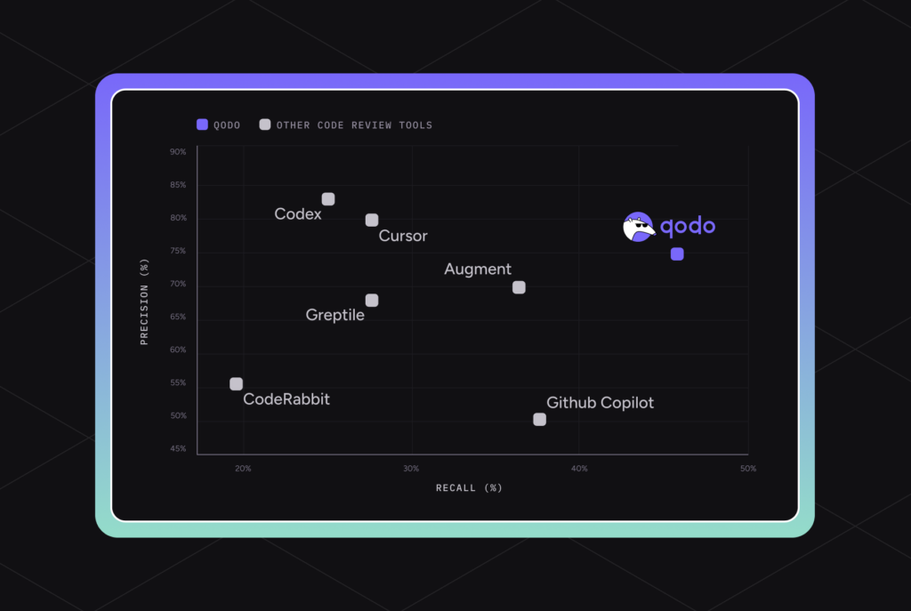 This novel approach is uniquely designed to simultaneously evaluate both code correctness (bug detection) and code quality (best practice enforcement) within a realistic code review context and at a significantly larger scale – 100 PRs containing a total of 580 issues. In a comparative evaluation pitting the Qodo model against 7 other leading AI code review platforms, Qodo demonstrated superior performance, achieving an F1 score of 60.1% for reliably identifying this diverse set of defects. The benchmark, including tools evaluated reviews, is publicly available in our benchmark GitHub organization. The following sections detail our benchmark creation methodology, experimental setup, comparative results, and key takeaways from this evaluation.