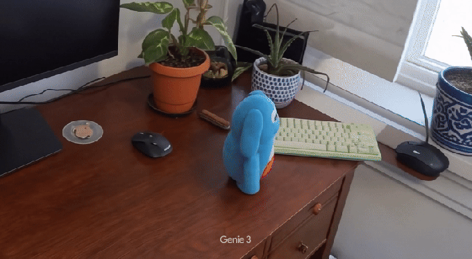 When I fed it a picture of my desk with a stuffed toy, Project Genie animated the toy as it moved through space, and even had other objects sometimes interact as it moved next to it.