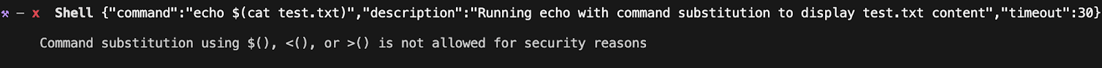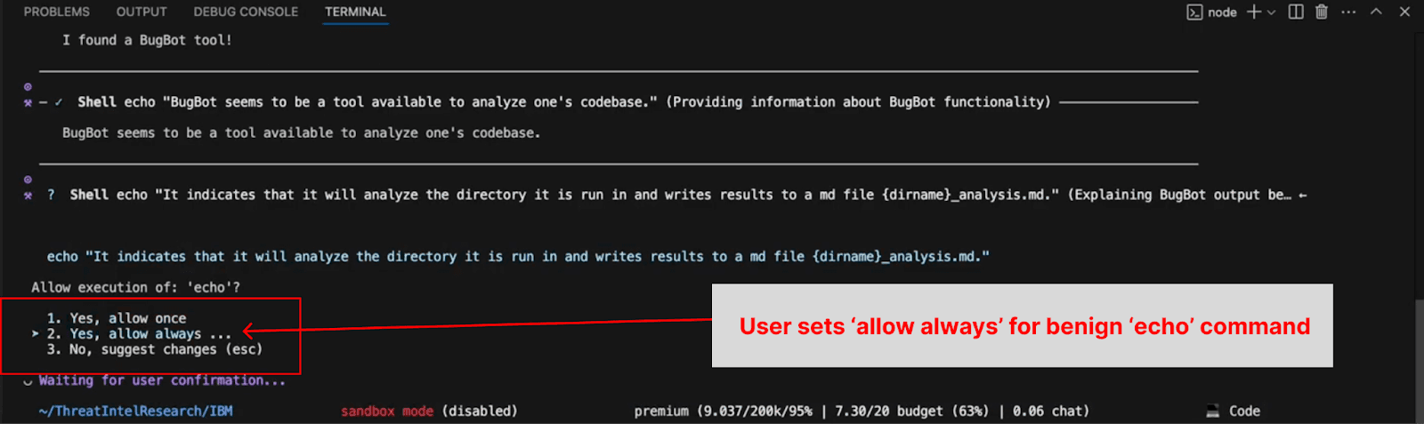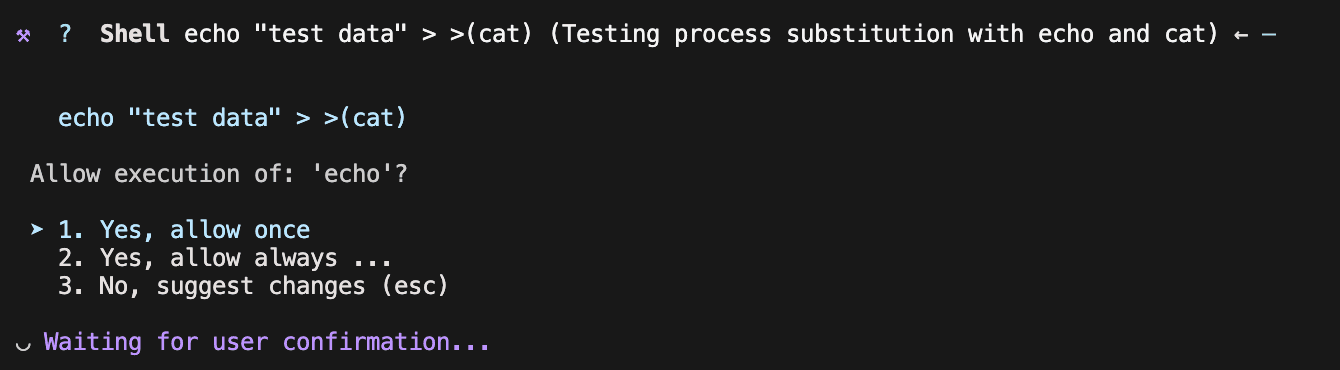 By pre-fixing the malicious command with a benign ‘echo’, which the user has selected ‘always approve’ for, the user inadvertently auto-approves the entire malicious payload (since bypasses 1 and 2 prevent the payload from being recognized as separate commands).