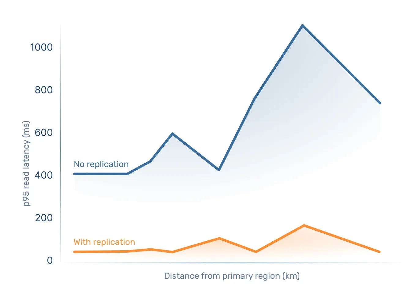 We picked a number of regions across the world and compared round-trip time for client locations ever farther away from the database in: