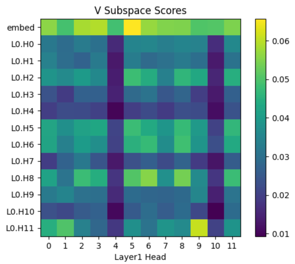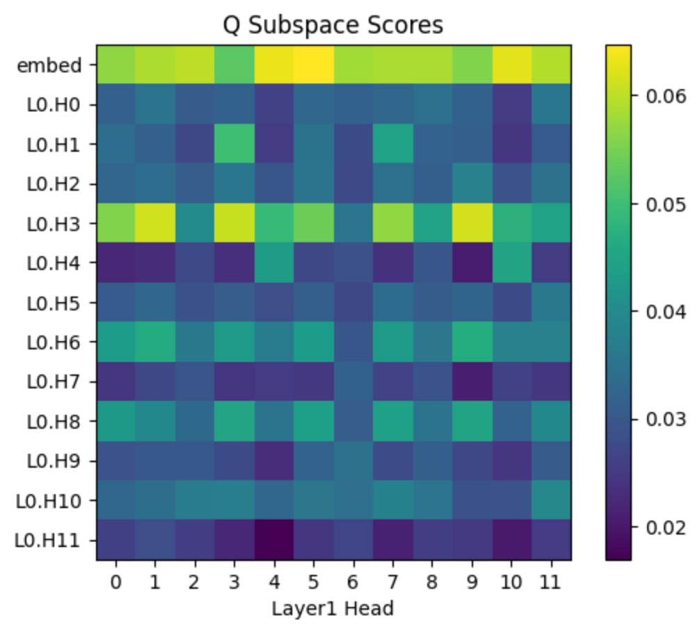 Here are the subspace scores for the layer 1 heads: