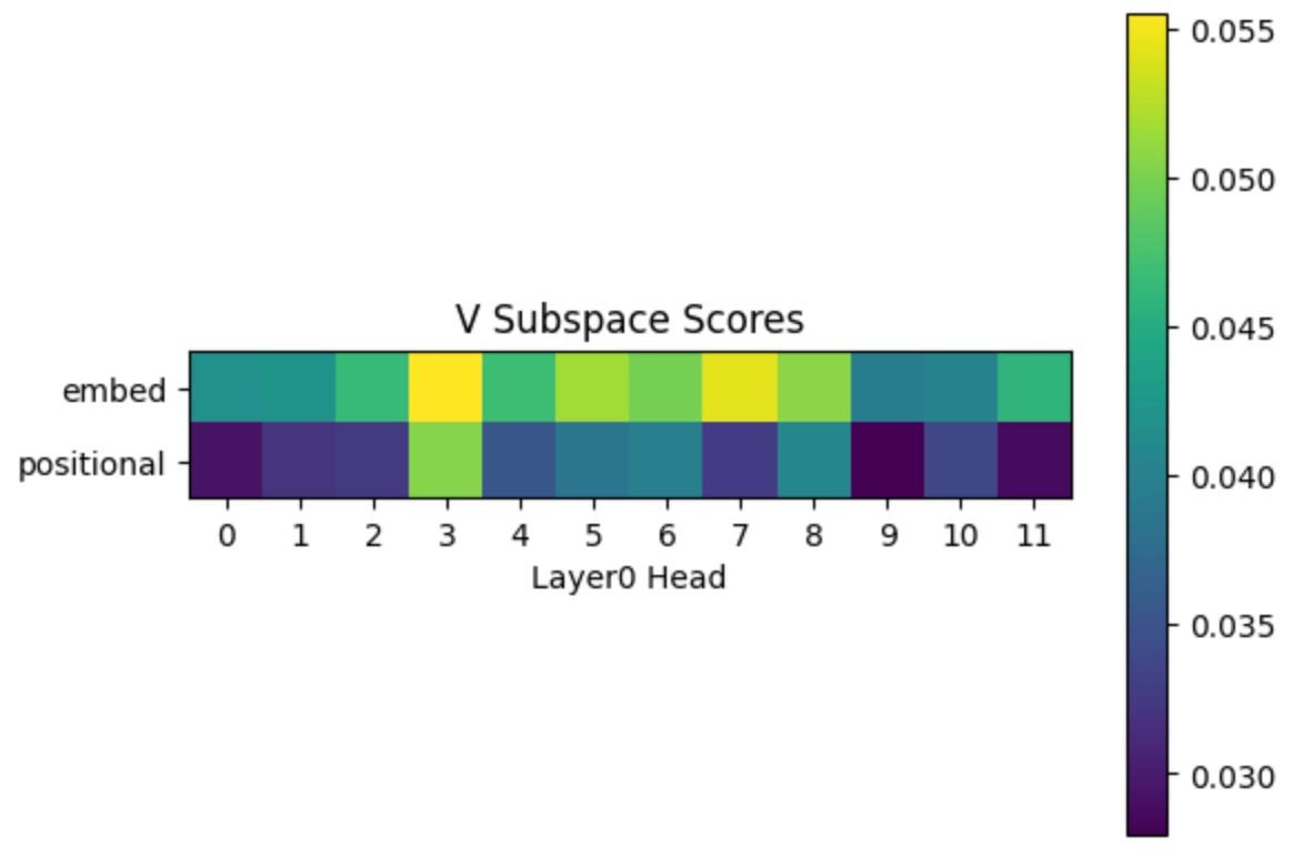 So we can see that the QK circuit of head 7 is mostly reading from the positional subspace. This determines which source token(s) will be attended to for each query. But what about the value that is loaded from the source token(s) and written into the destination query’s residual stream? This is determined by the subspace score of the head’s OV circuit. Again, for heads in layer 0, there are only two possibilities: the embedding or positional encoding. Here are the OV subspace scores for each head: