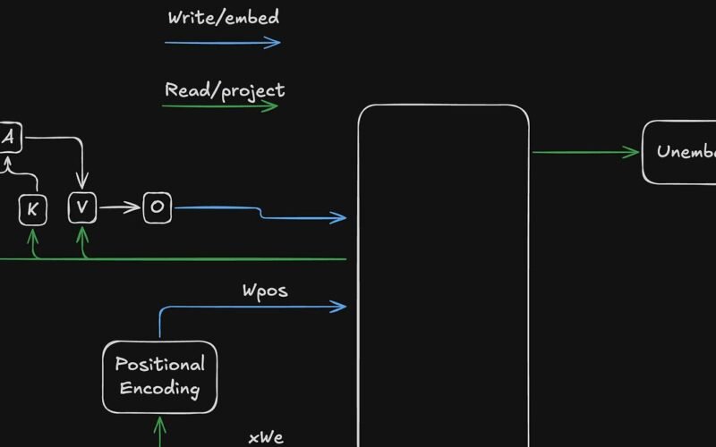 Framework does a deep dive into the key components of a simplified transformer-based language model. It analyzes transformer blocks that only have multi-head attention. This means no MLPs and no layernorms. This leaves the token embedding and positional encoding at the beginning, followed by n layers of multi-head attention, followed by the unembedding at the end. Here is a picture of a single-layer transformer with one attention head only: