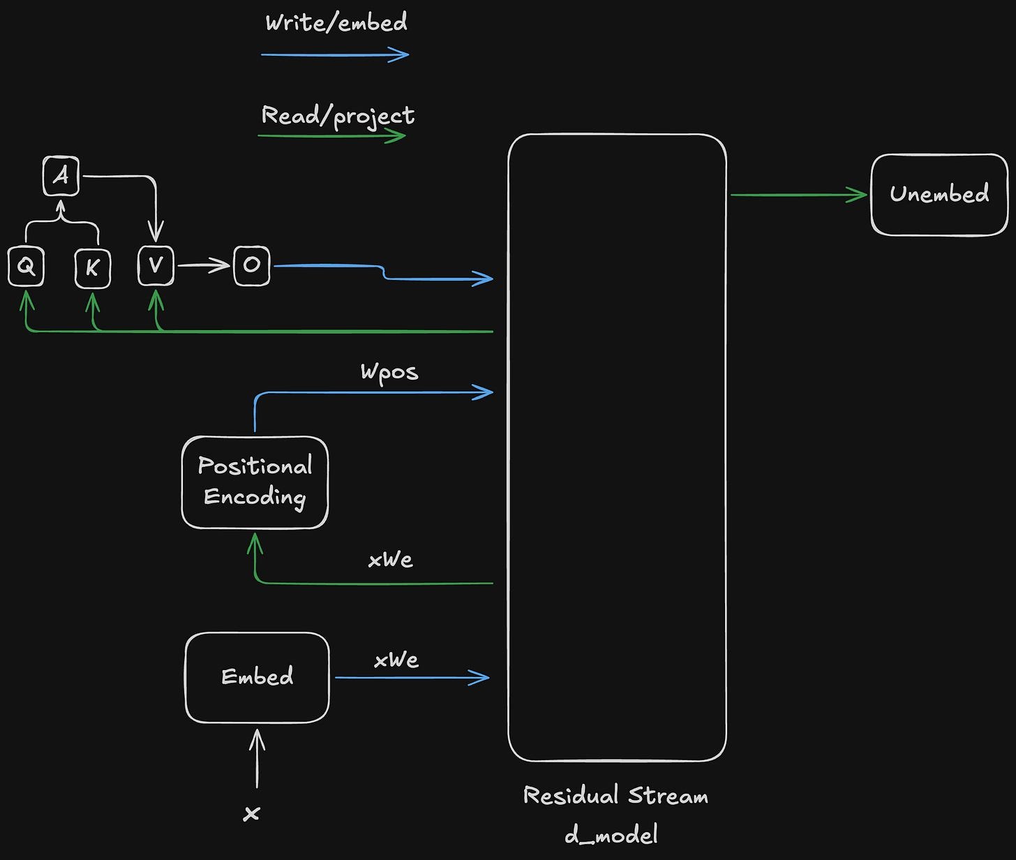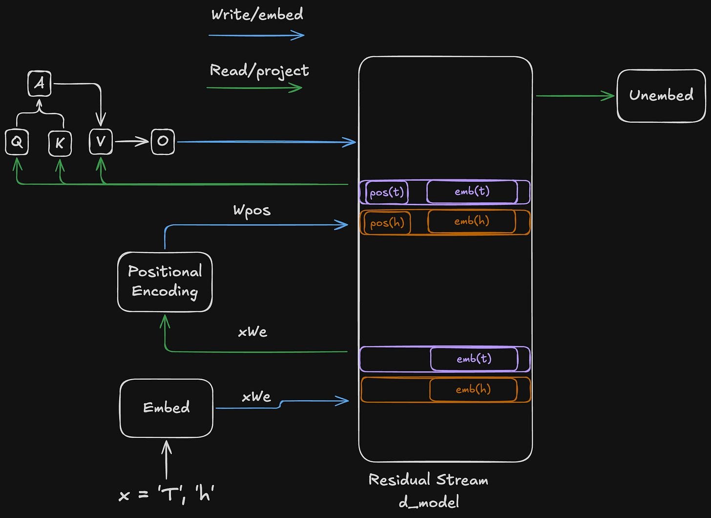 One point of clarification on the token:subspace address. In the attention section above, I said that attention computes the token part of the token:subspace address. However, this really applies only to the OV circuit’s token. Both the query and key sides of the QK circuit use an implicit token of just whatever the “current” token is, with each token being computed in parallel. However, the OV circuit doesn’t know which tokens to look at, and so the OV circuit’s token part of the address is provided by attention from the QK circuit. However, the Q, K, and V inputs of each head all learn the optimal subspace scores independently, completing the full two-part address needed to perform the head’s overall operation.