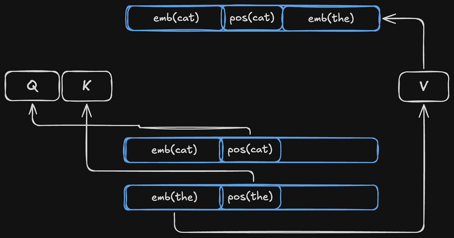 Head 7’s OV circuit scores higher with the embedding than with the positional encoding. This means that head 7 will add the embedding of the previous token into the current token’s residual stream. Given our example “the cat sat on the mat. the dog sat on the log.”, the residual stream of token “cat” will look like this after the forward pass through layer 0: