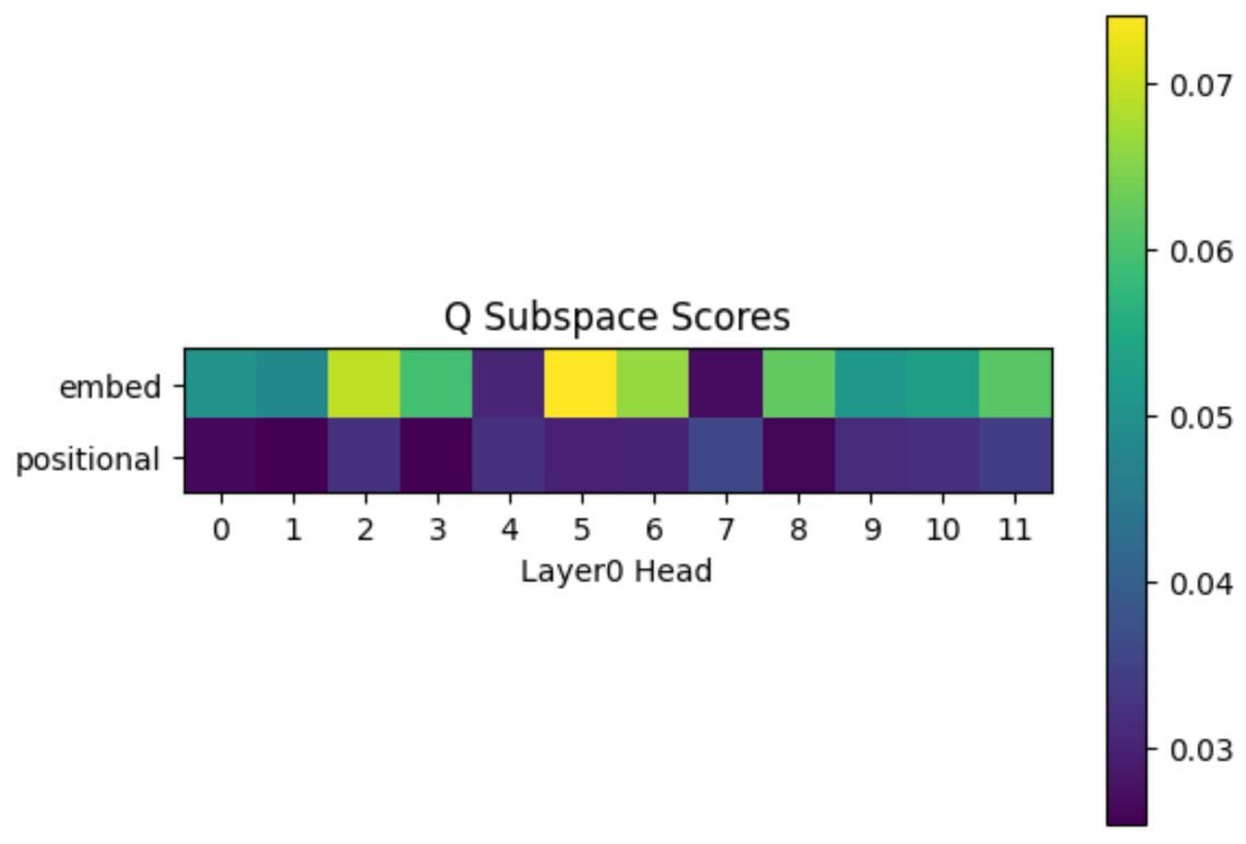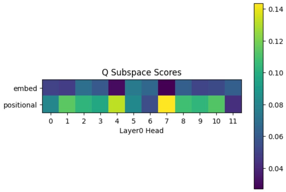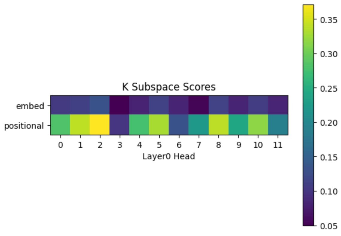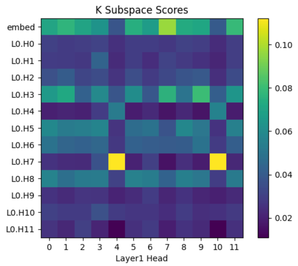 The layer 0 heads only have two options: the embedding or the positional encoding. Since “previous token” doesn’t depend on what the token is, but is just positional information, we would expect head 7 to learn a higher subspace score for the positional encoding subspace relative to the embedding subspace.