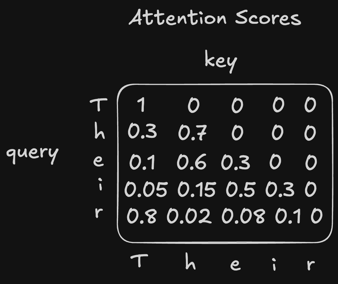 Conceptually, attention computes the first part of the token:subspace address. The fundamental purpose of attention is to specify which source token locations to load information from. Each row in the attention matrix (see fake example below for tokens ‘T’, ‘h’, ‘e’, ‘i’, ‘r’) is the “soft” distribution over the source (i.e. key) token indices from which information will be moved into the destination token (i.e. query).