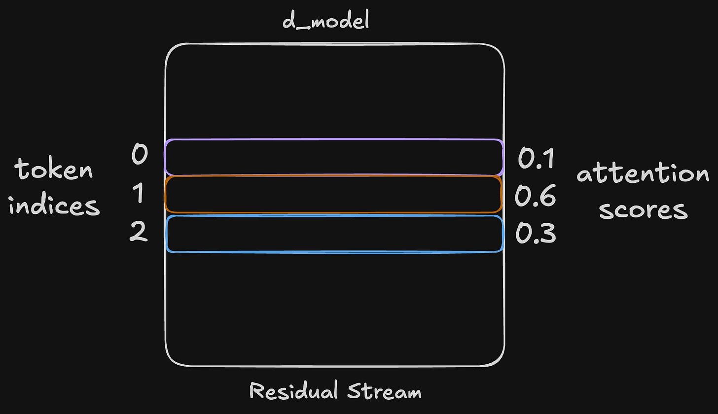 It is important to understand that attention is all about figuring out the token indices to read from. If we look at the residual stream as a two dimensional memory array, then attention probabilistically selects rows of this memory for each query. For example, the third query above (‘e’) would have a token address that looks something like 0.1,0.6,0.3: