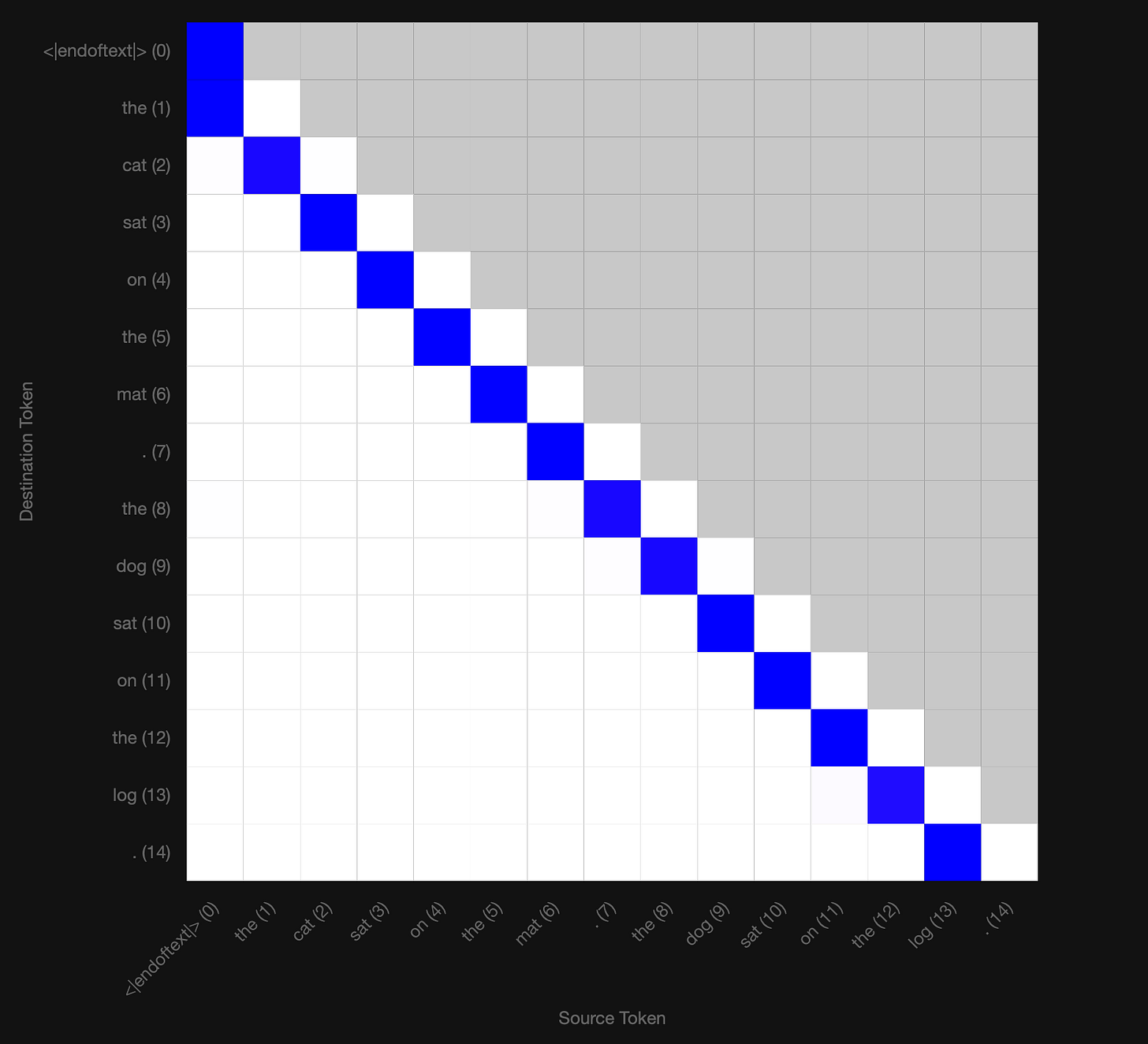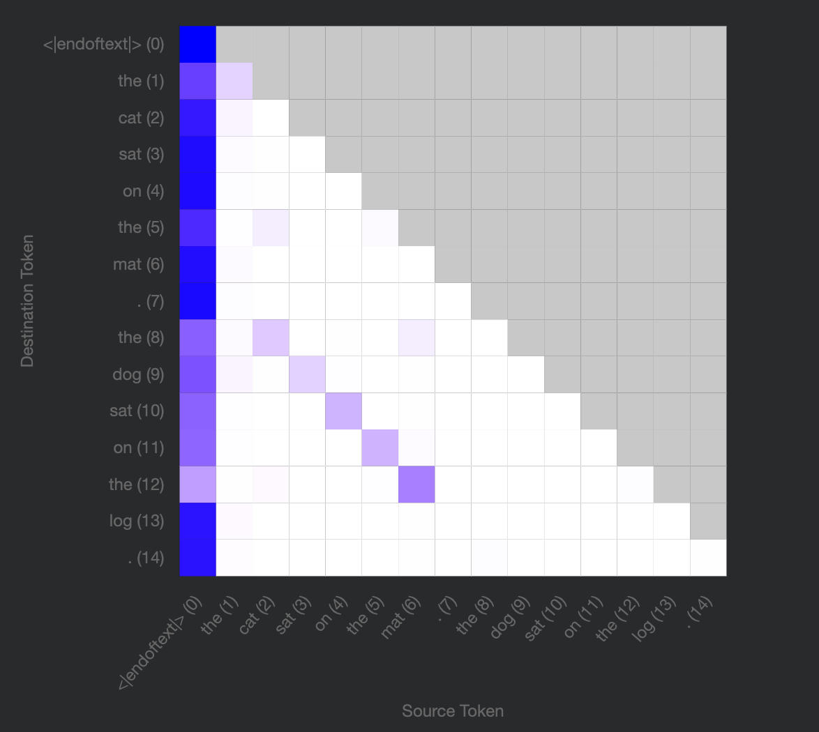 Let’s look at the extreme case, when the entry is 1 and all the others in the row are 0. This means that this head reads some subspace(s) of the source token’s (‘T’) residual stream and copies it verbatim into some subspace(s) of the destination token’s (also ‘T’) residual stream. But since attention is 1, there is only one source token position being read from. Otherwise the read is “spread out” over multiple source tokens according to the attention scores in each row. For example the second query above (‘h’) reads “30%” from token 0 (‘T’) and “70%” from itself.