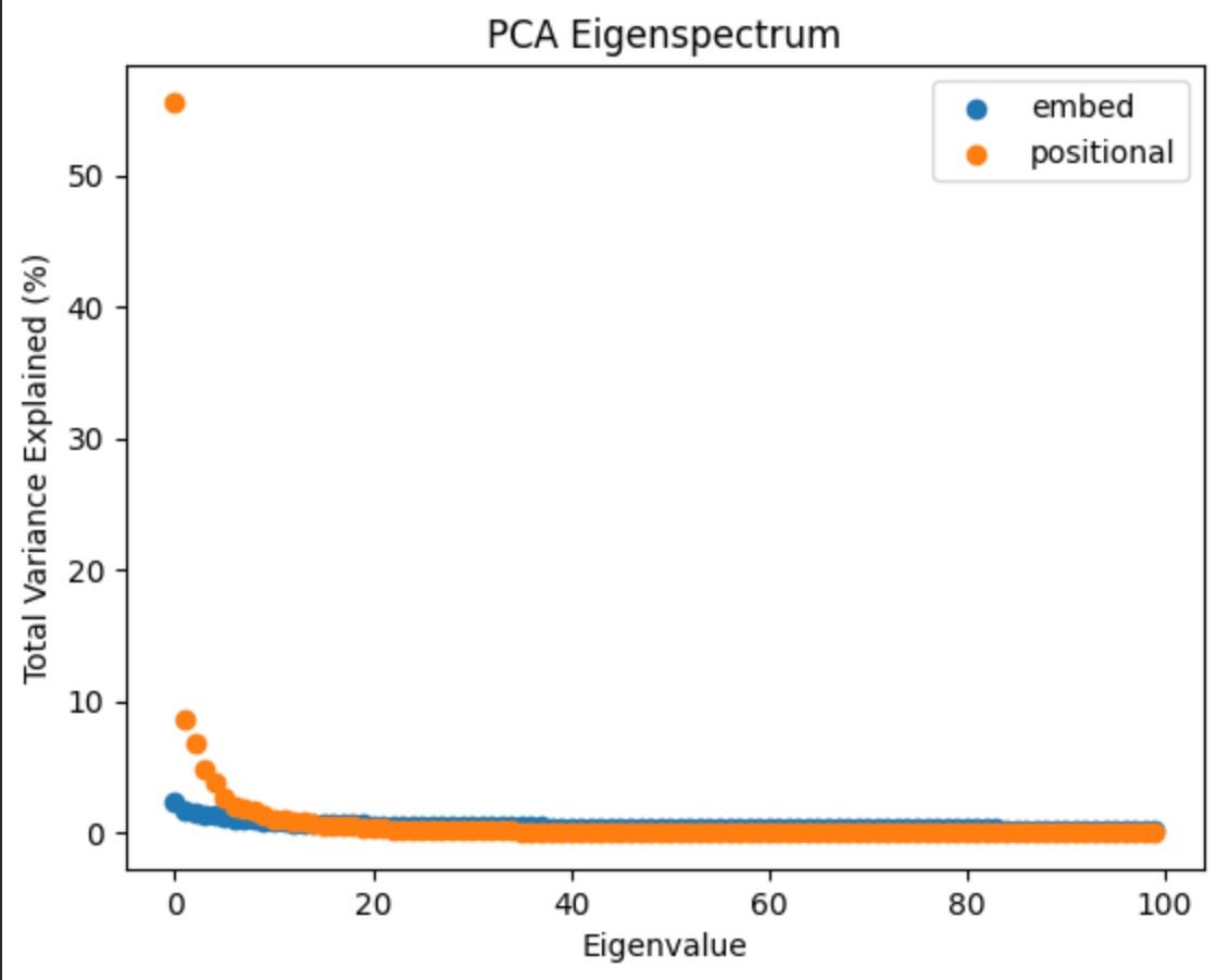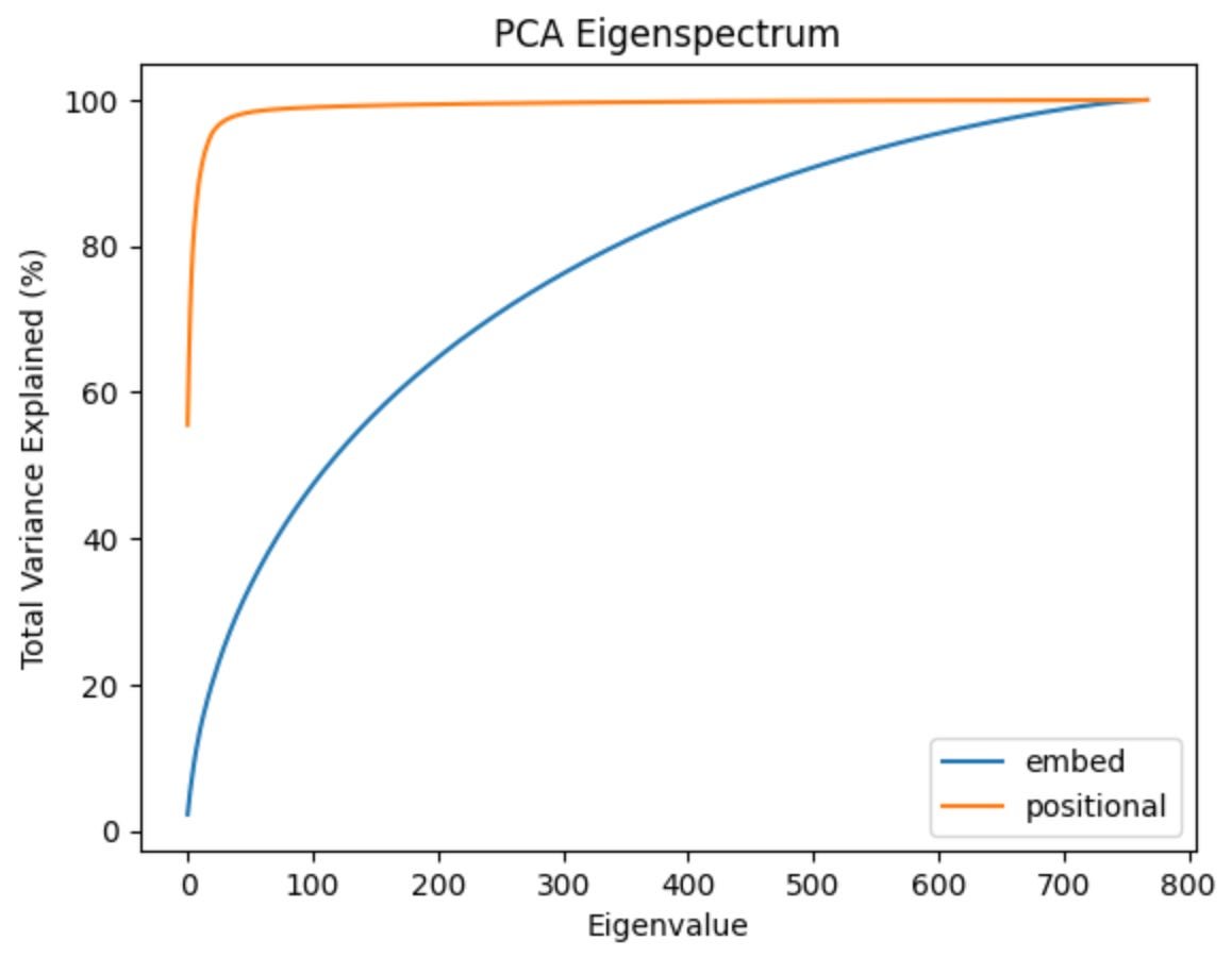 So about 80% of the embedding variation lives in a 350-dimensional subspace of d_model. This is fairly large given that d_model is 768. Compare that to the positional encoding, which is essentially explained by only 5 directions.