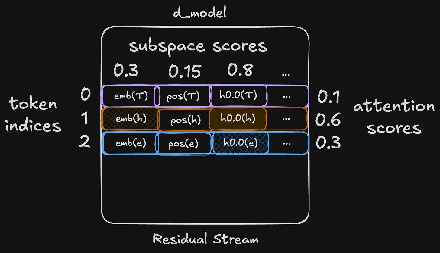 While attention scores are learned indices into the rows of the residual stream, subspace scores are learned “coefficients” that provide a soft index into the “column dimension” of the residual stream. The model is able to do this because the W_QK and W_OV matrices are low-rank: d_head is conventionally much smaller than d_model. This allows for low-dimensional subspaces to be used for different purposes. Each component that reads from the residual stream learns to read from a distinct linear combination of subspaces.