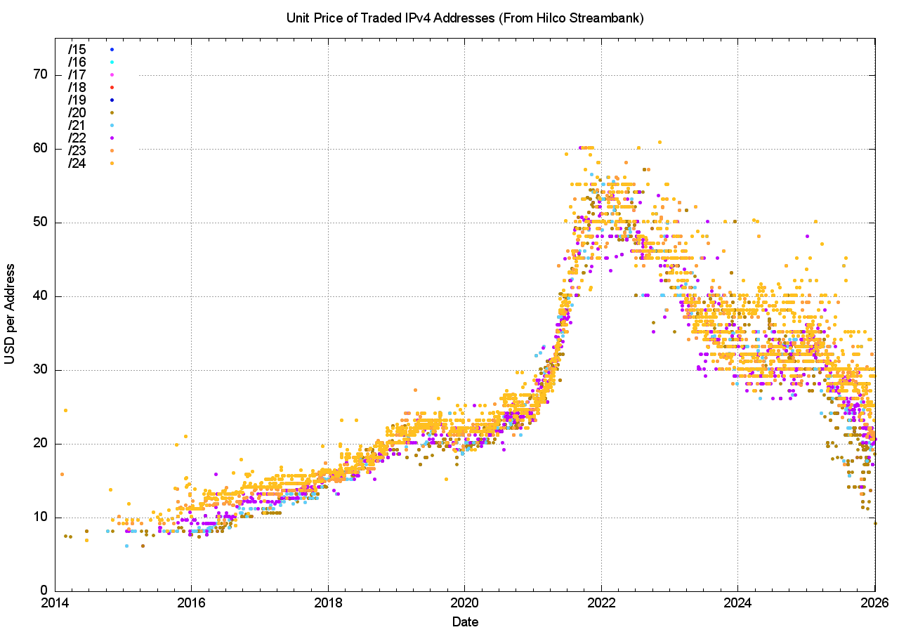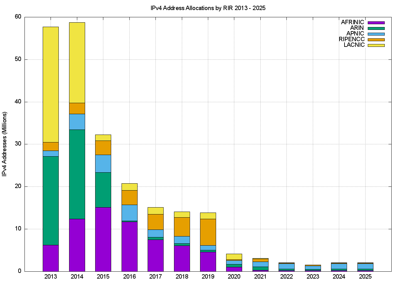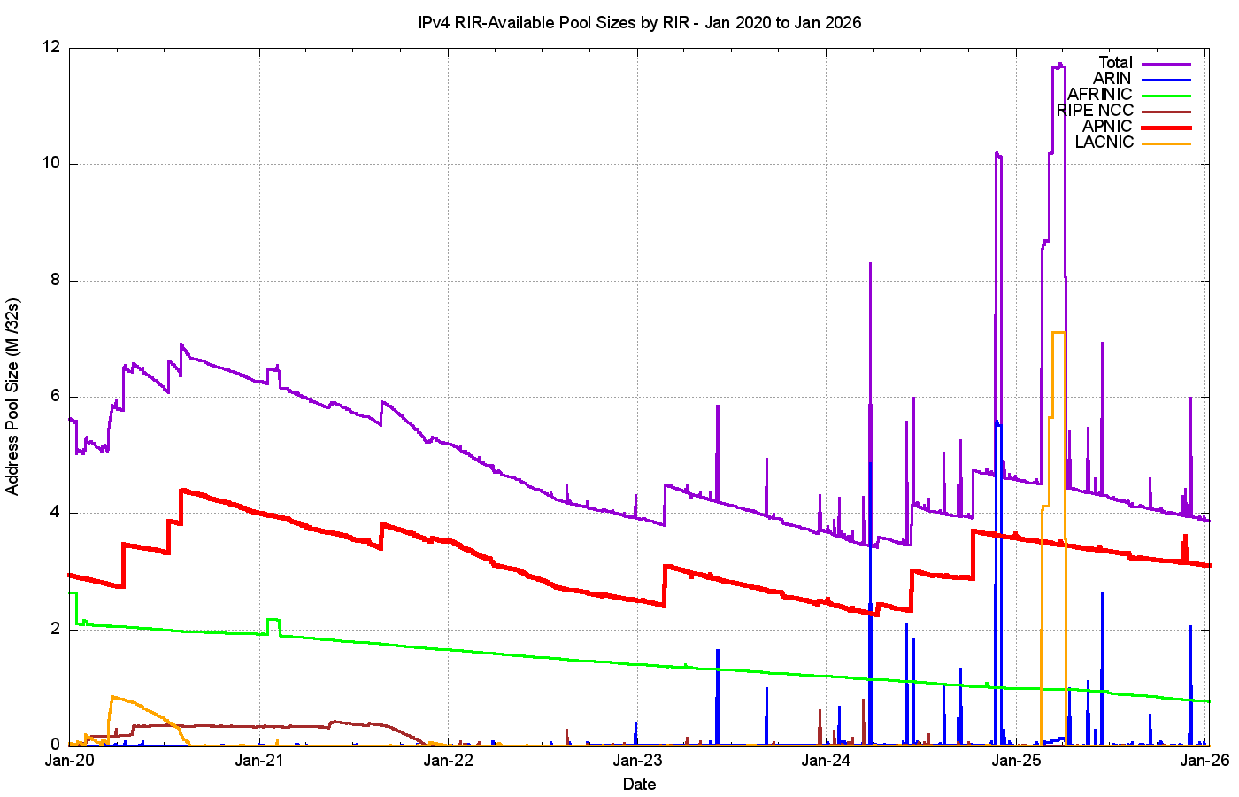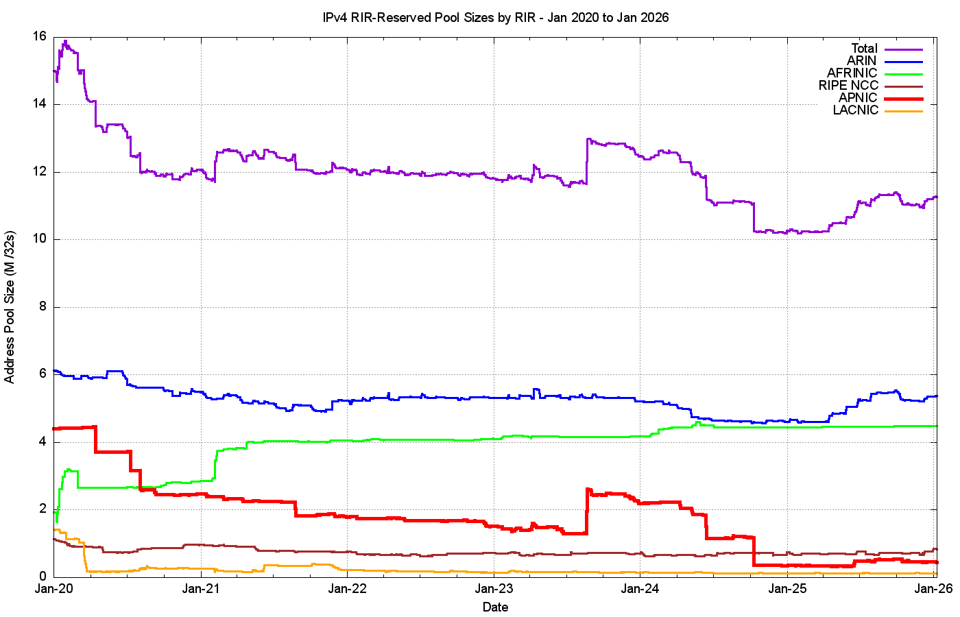 Only APNIC and AFRINIC are operating with relatively large pools of available addresses. At the start of 2026 APNIC had some 2,849 address blocks in its registry that were marked as available, with a total pool size of 3.095M addresses. AFRINIC has 19 address blocks similarly marked, with a total pool size of 0.765M addresses. For both of these RIRs, the allocation rates from these pools are small, and even without any further returns of addresses these available address pools will likely last from some years to come at current allocation rates.