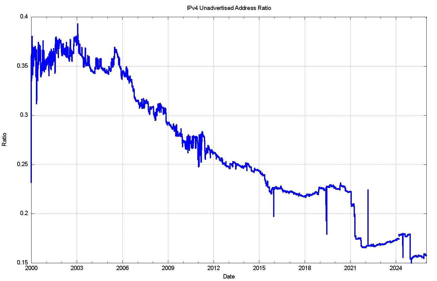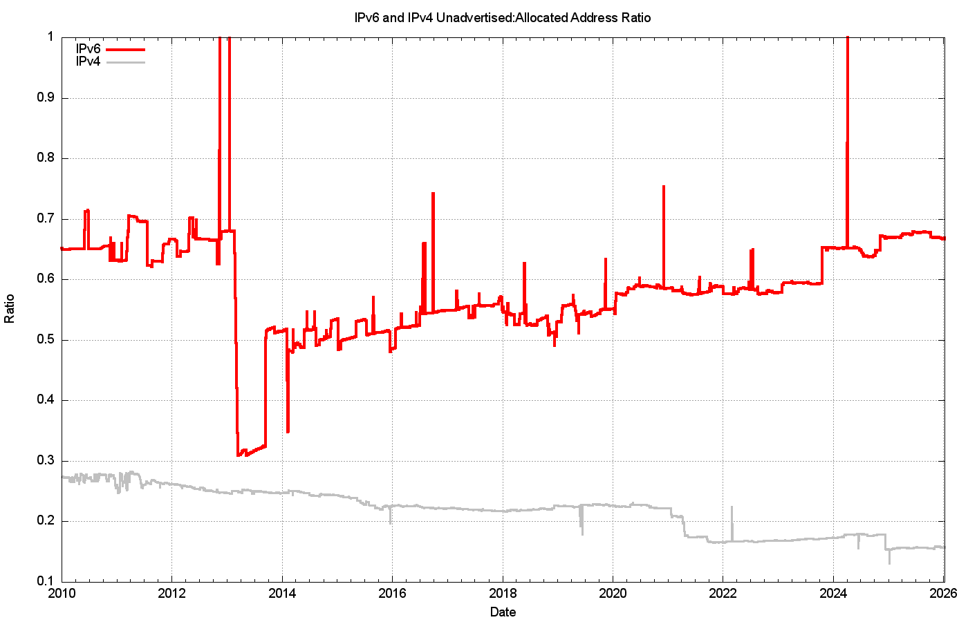 At the start of 2026 we’ve advertised an IPv6 address span which is the equivalent of some 160,000 /32s, or some 10.5 billion end-site /48 prefixes. That is just 0.0037% of the total number of /48 prefixes in IPv6.