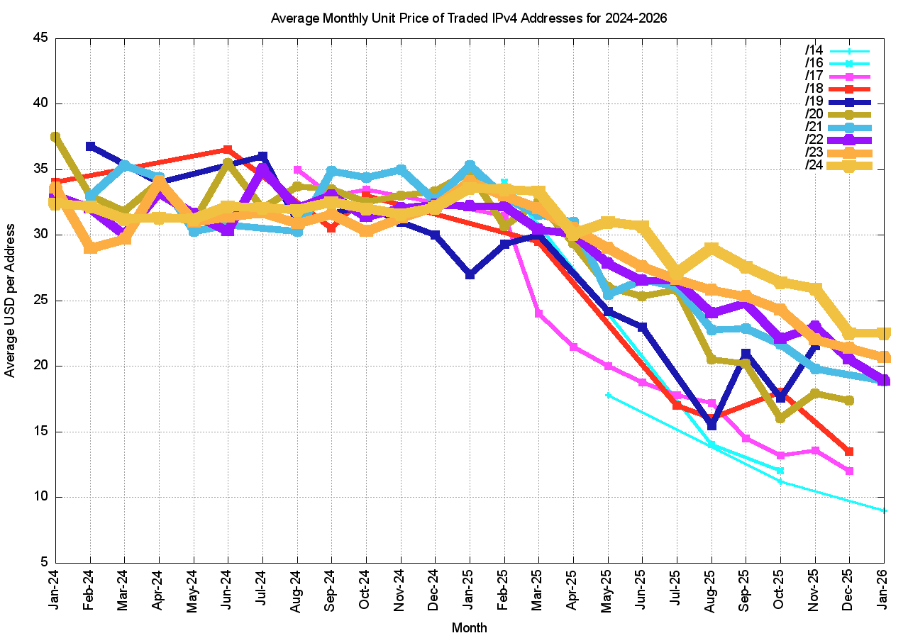 It is clear from these two figures that the average size of an IPv4 address allocation has shrunk considerably in recent years, corresponding to the various IPv4 address exhaustion policies in each of the RIRs.