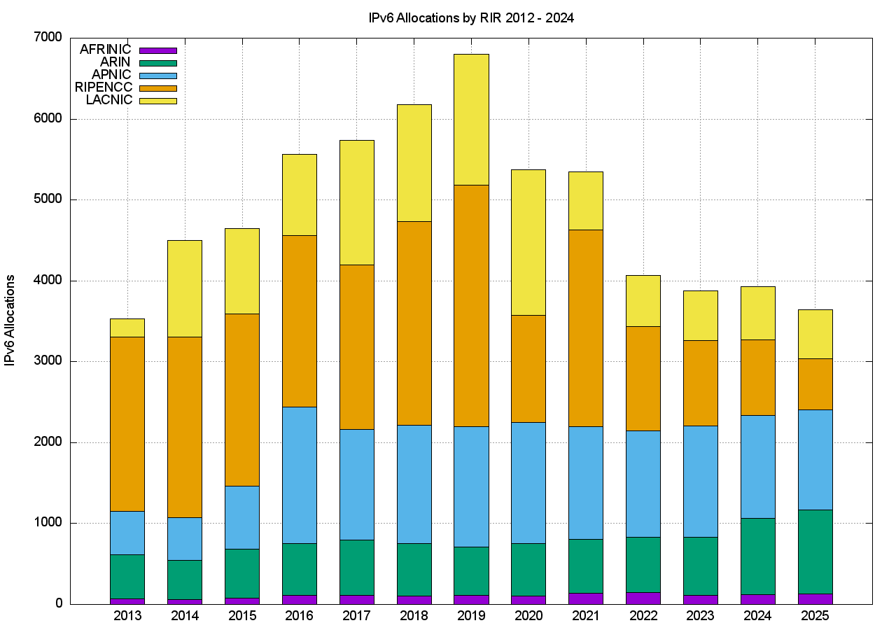 The number of IPv6 address allocations has been steadily falling since 2019, as shown in Figure 19. There was a more dramatic fall in the volume of allocated addresses in 2025, although the numbers for 2023 and 2024 were buoyed up by single very large allocations in each of those two years, firstly by ARIN in 2023 and APNIC in 2024.