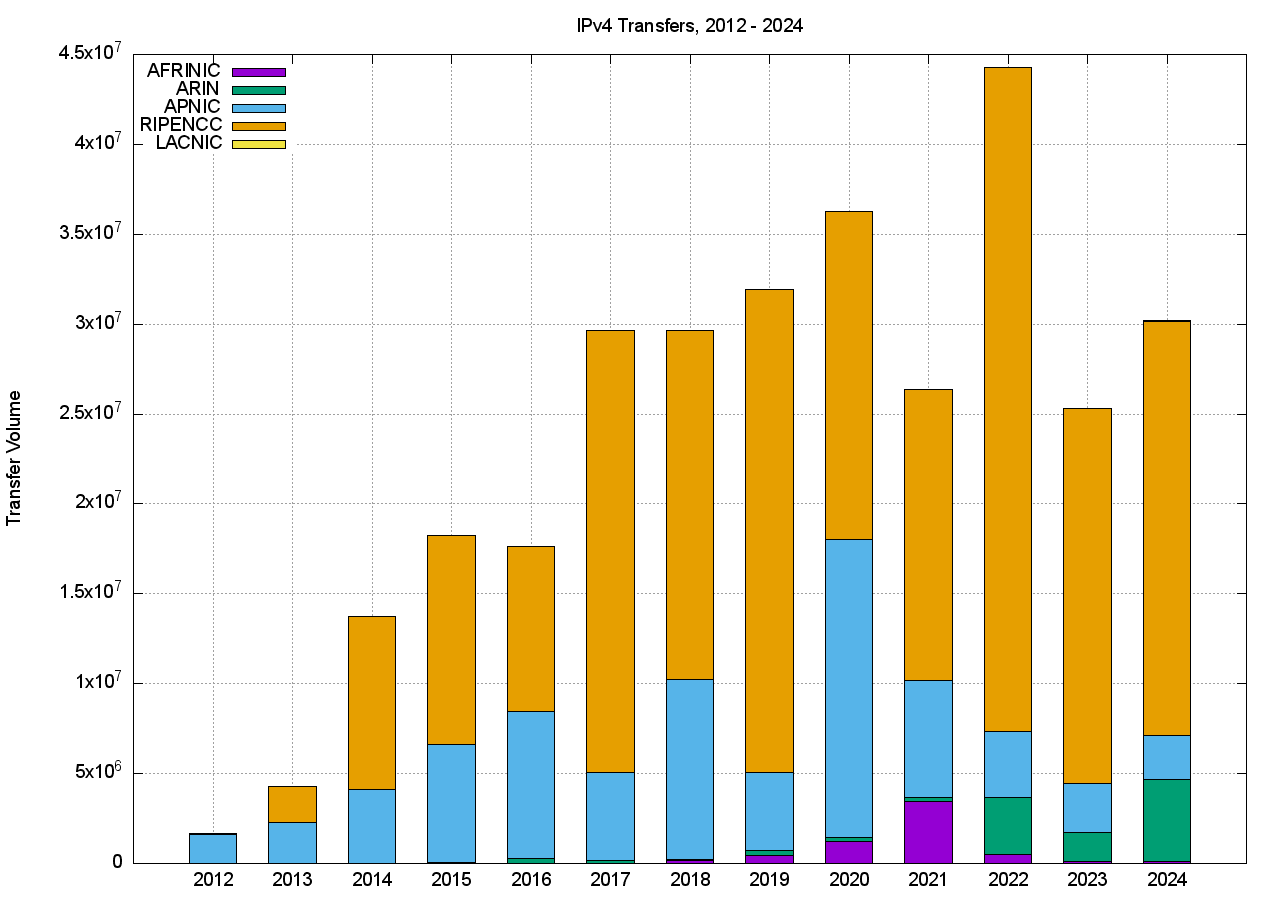 The aggregate total of addresses that have been listed in these transfer logs since 2012 is some 342 million addresses, or the equivalent of 20.4 /8s, which is some 9.3% of the total delegated IPv4 address space of 3.7 billion addresses. However, that figure is likely to be an overestimate, as a number of address blocks have been transferred multiple times over this period.