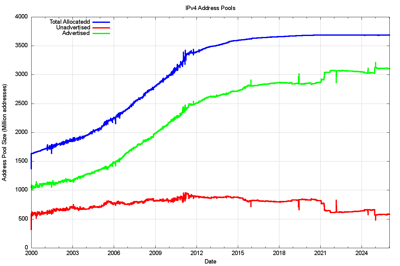 The total IPv4 allocated address pool contracted by some 237 thousand addresses in 2025, with some 3.687 billion allocated addresses at the end of the year. This represented a contraction of some 0.01% for the total allocated IPv4 public address pool through 2025 (Table 1).